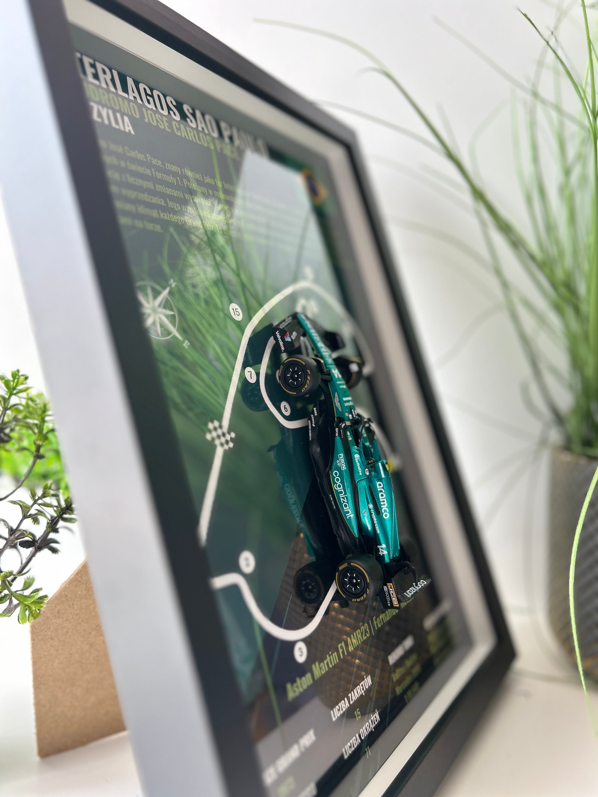 Brytyjska elegancja i wyścigowy styl – zanurz się w świat emocji F1 z ramką 3D Aston Martin Aramco Formula One Team na tle legendarnego toru São Paulo!