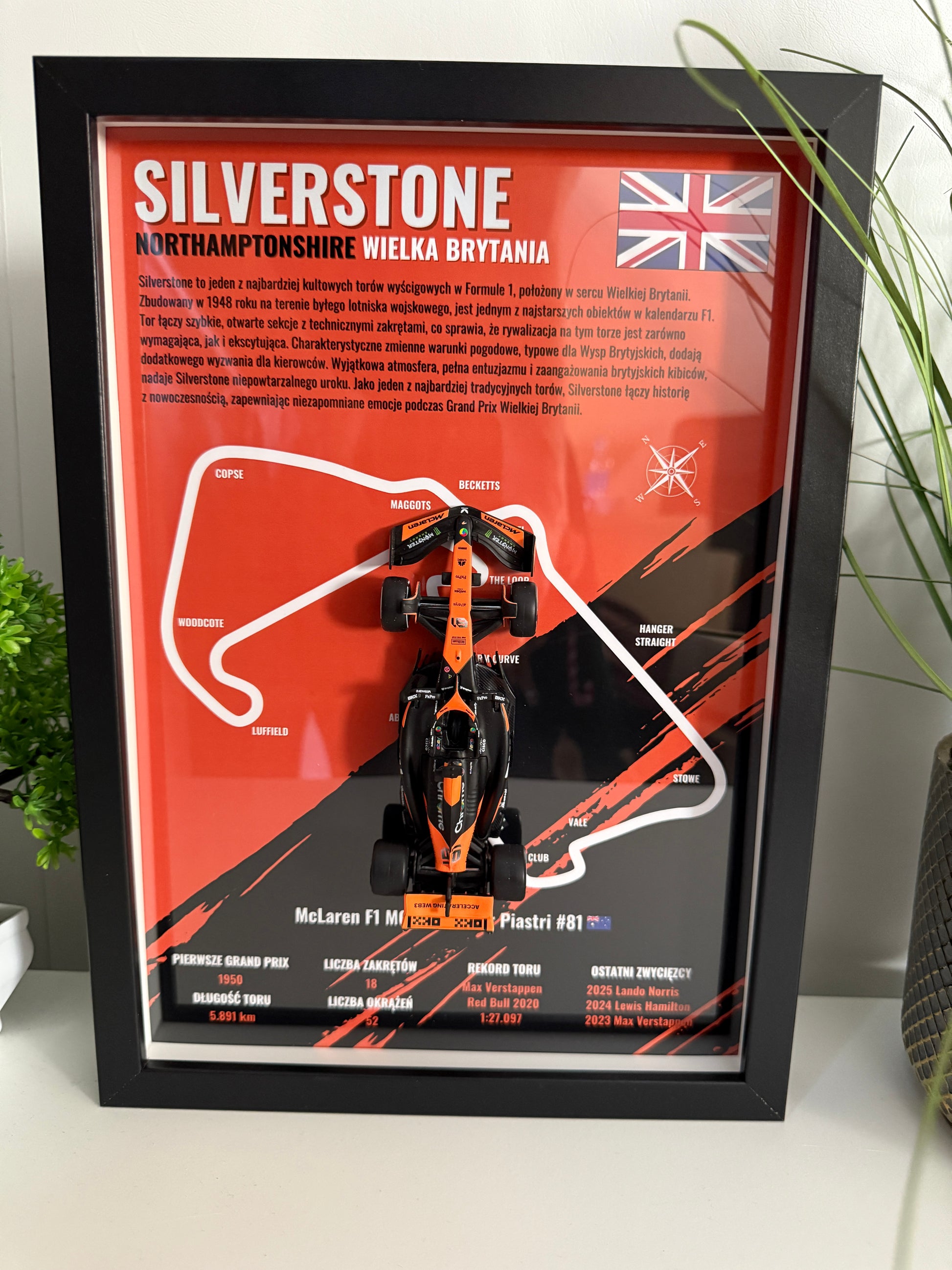 W ramce znajdziesz starannie wykonany model bolidu McLaren w skali 1:43 oraz autorską grafikę inspirowaną torem Silverstone w Wielkiej Brytanii – pełną wyścigowych detali, statystyk i historycznego klimatu. Tło utrzymane jest w charakterystycznych pomarańczowo-czarnych barwach zespołu, a całość dopełniają infografiki z ciekawostkami o torze: rekordy okrążenia, zwycięzcy, długość trasy, liczba zakrętów i okrążeń oraz inne kultowe informacje.