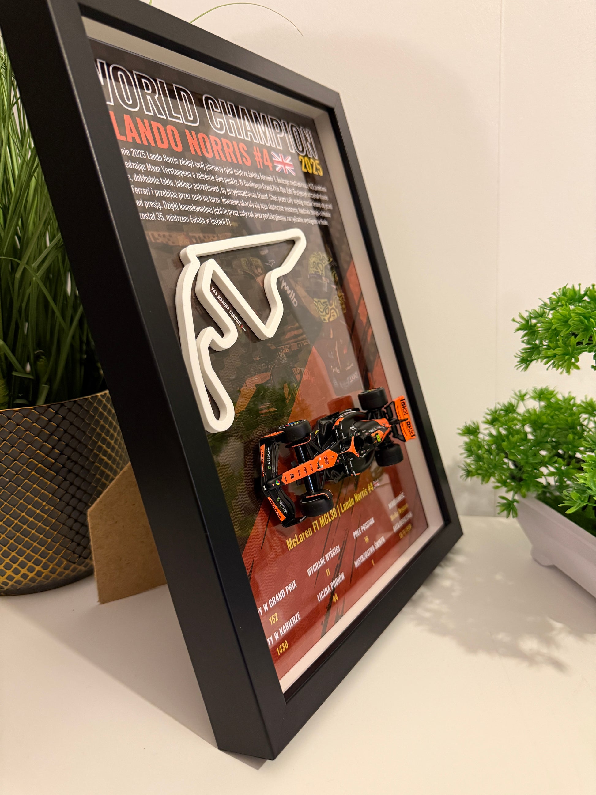 Pomarańczowa pasja, chłodna głowa i historia, która na zawsze pozostanie w sercach fanów — poczuj emocje wielkiego finału sezonu dzięki ramce Lando Norris – World Champion 2025 z trójwymiarowym torem Yas Marina!