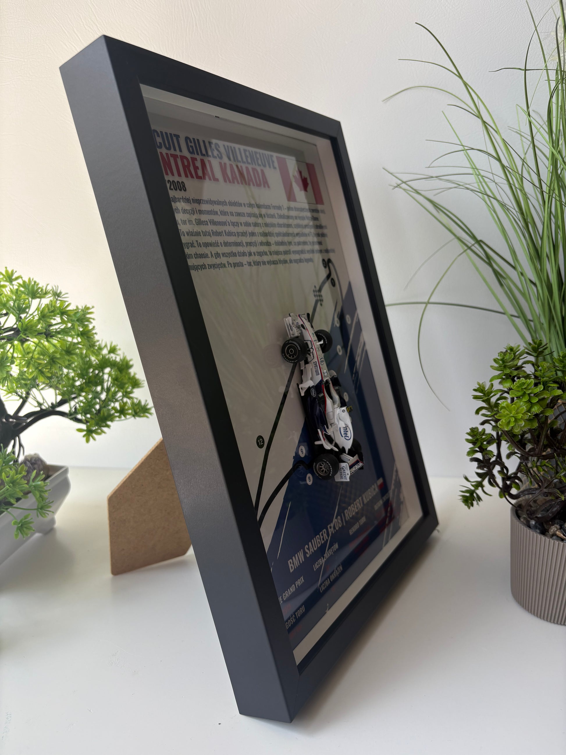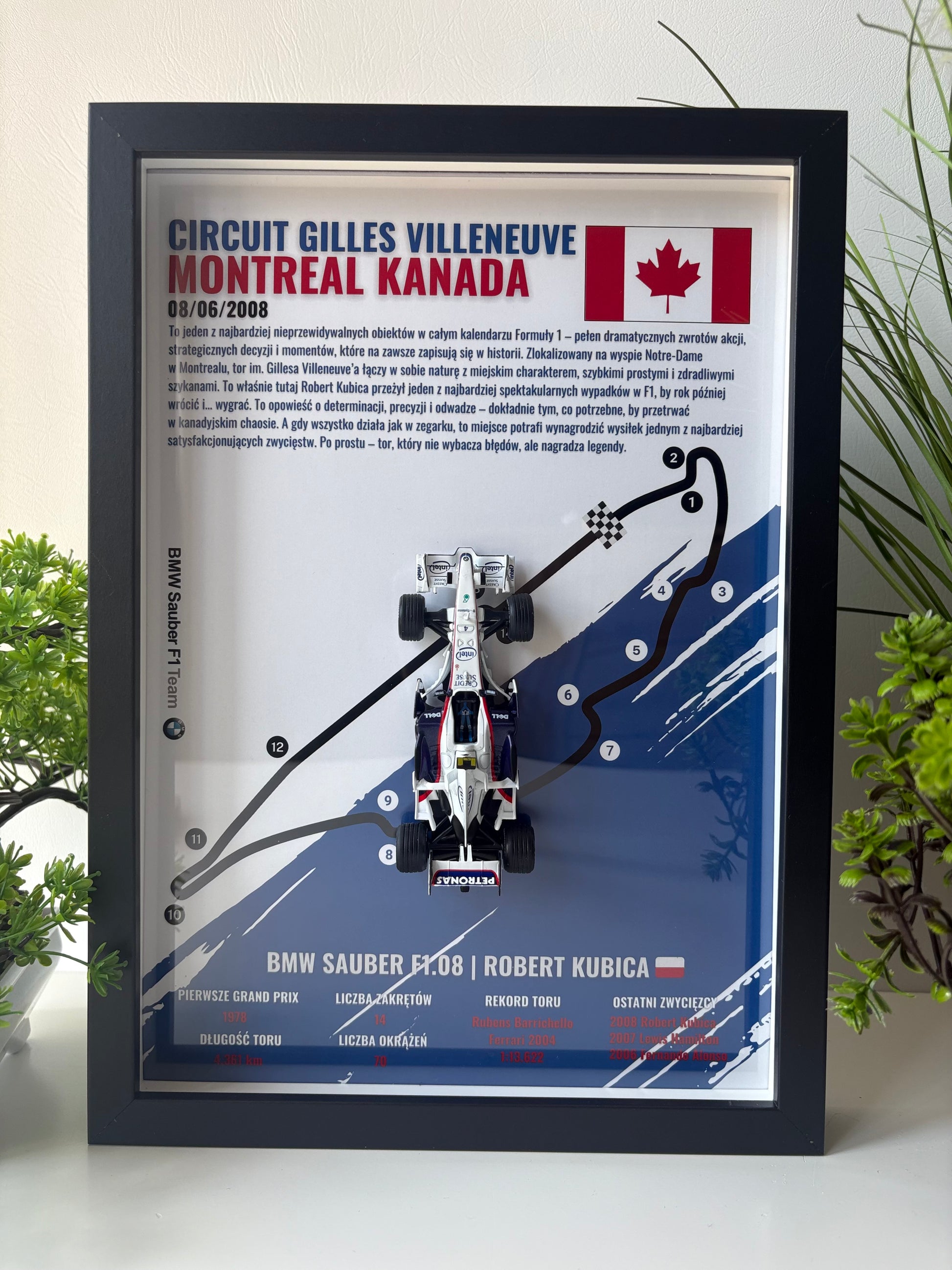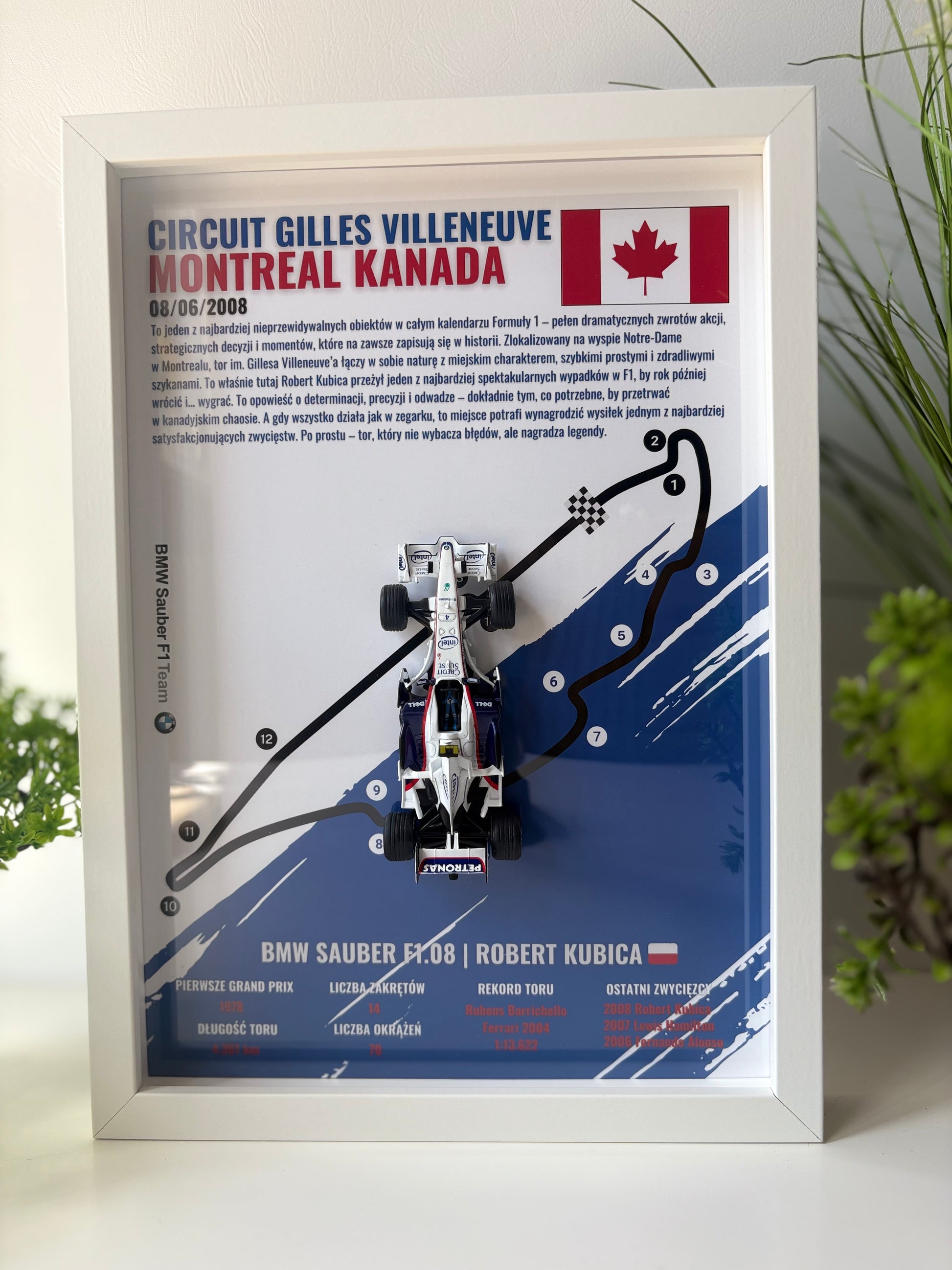 BMW Sauber F1.08 | Grand Prix Kanady 2008 to wyjątkowa ramka 3D z oficjalnym modelem bolidu Roberta Kubicy - maszyny, która przyniosła Polsce pierwsze zwycięstwo w Formule 1. To nie tylko ozdoba, ale prawdziwy hołd dla jednego z najważniejszych momentów w historii polskiego motorsportu. Ramka została wykonana z najwyższą precyzją 🔧, oddając detale auta oraz układ legendarnego toru w Montrealu.